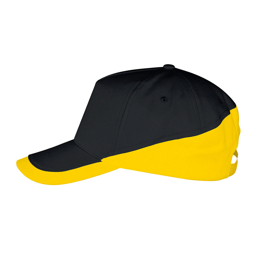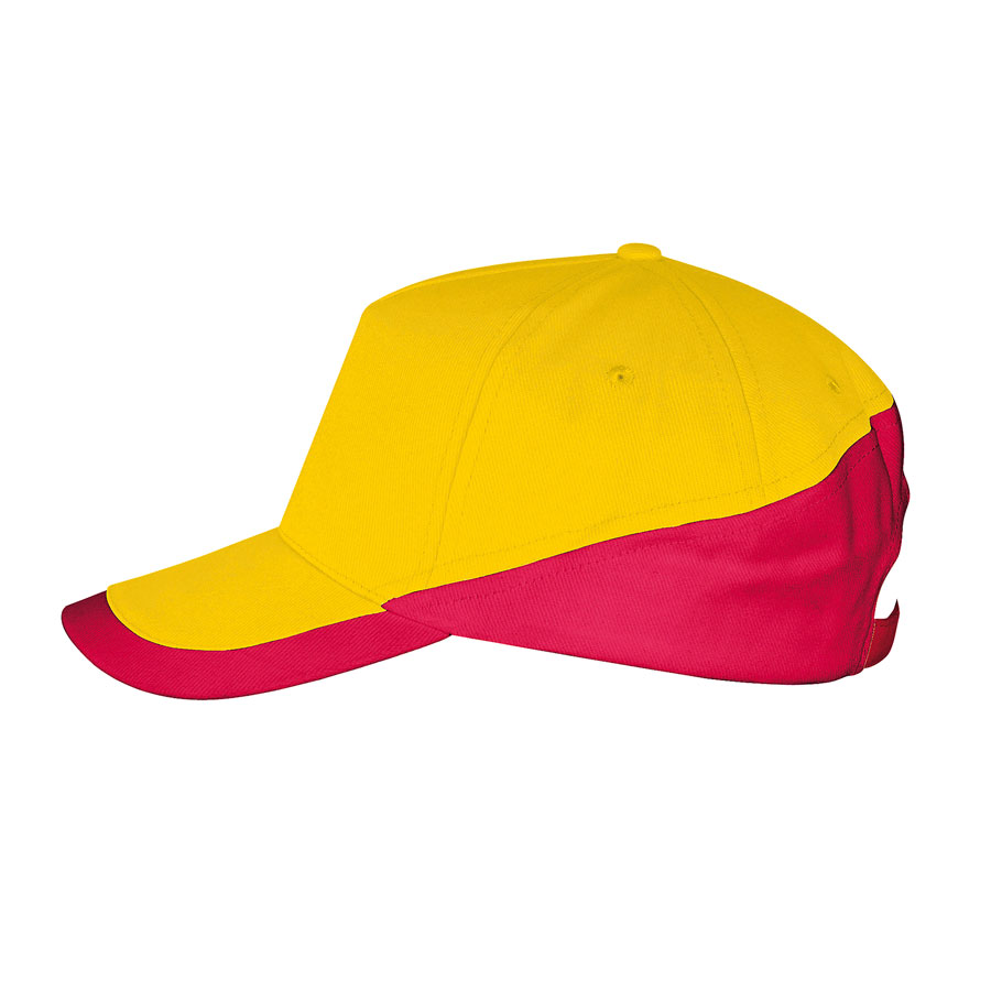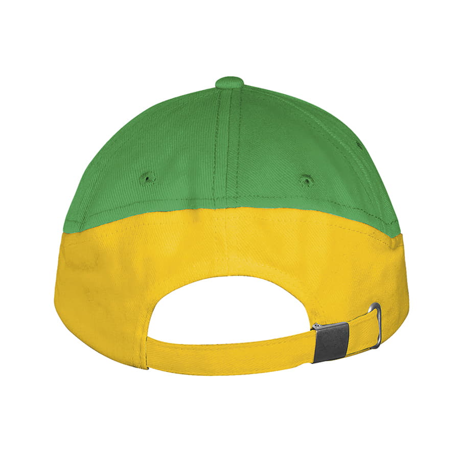 Двухцветная бейсболка BOOSTER без лобового шва с жестким козырьком «сэндвич». 4 вышитых люверса, регулируемая металлическая застежка. Цвет (зелёный), близкий к PANTONE 348C Цвет (жёлтый), близкий к PANTONE 1225C58,5 см — средний размер, с помощью застёжки его можно увеличить или уменьшить до необходимого.