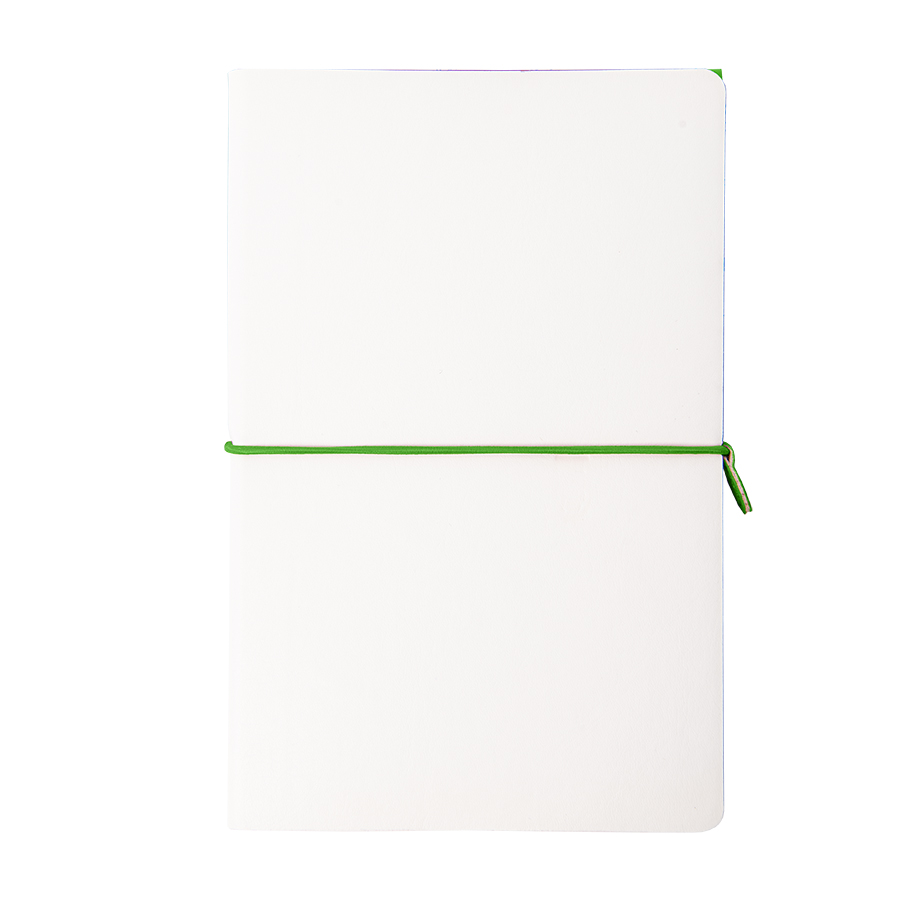 с оборотной стороны — яркий PU Silk Plus (цвет, близкий к pantone 355C). — два разных внутренних блока по 96 страниц соединены под одной обложкой: