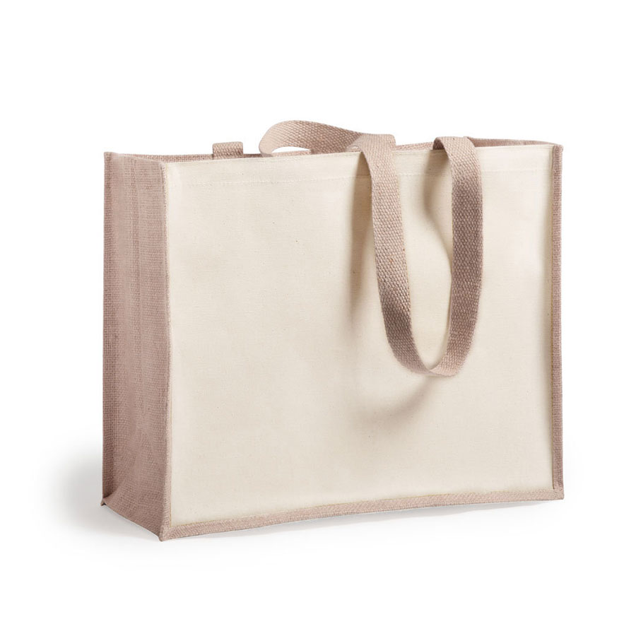 Сумка для покупок выполнена из хлопка и джута. Джут — это растение из семейства липовых. Из его листьев и стеблей производят натуральное волокно, верёвки, канаты, джутовую нить. Производители одежды и аксессуаров шьют из лёгкой джутовой ткани рубашки, штаны, платья и, конечно, сумки. Невысокая цена и лаконичность моделей обеспечивают большую популярность джутовых сумок.