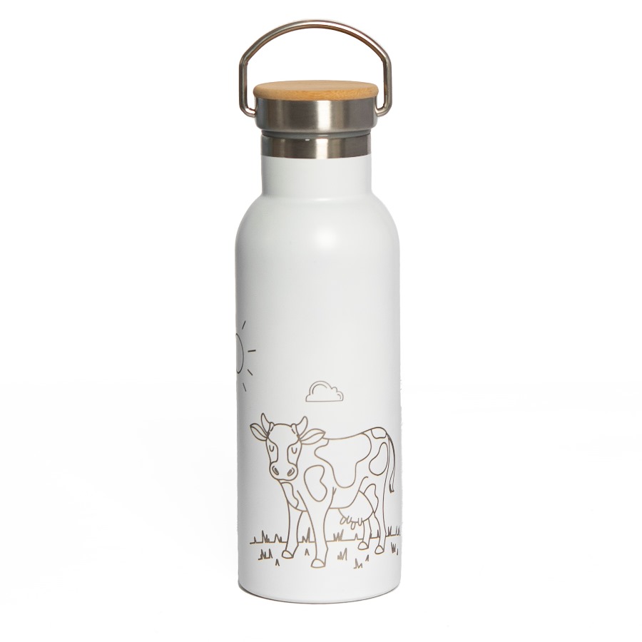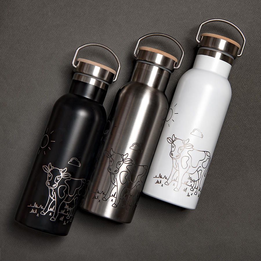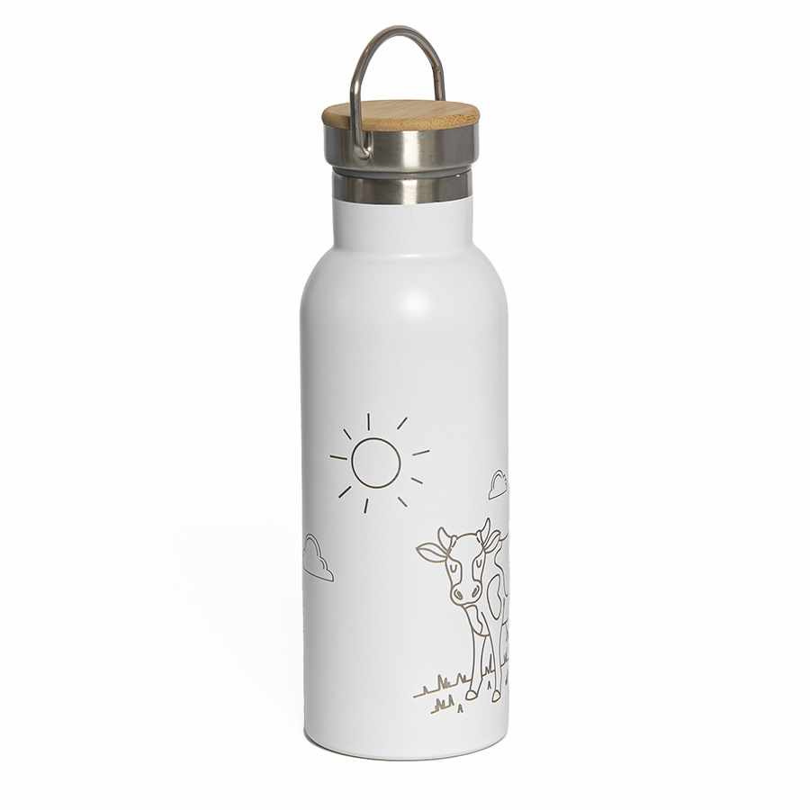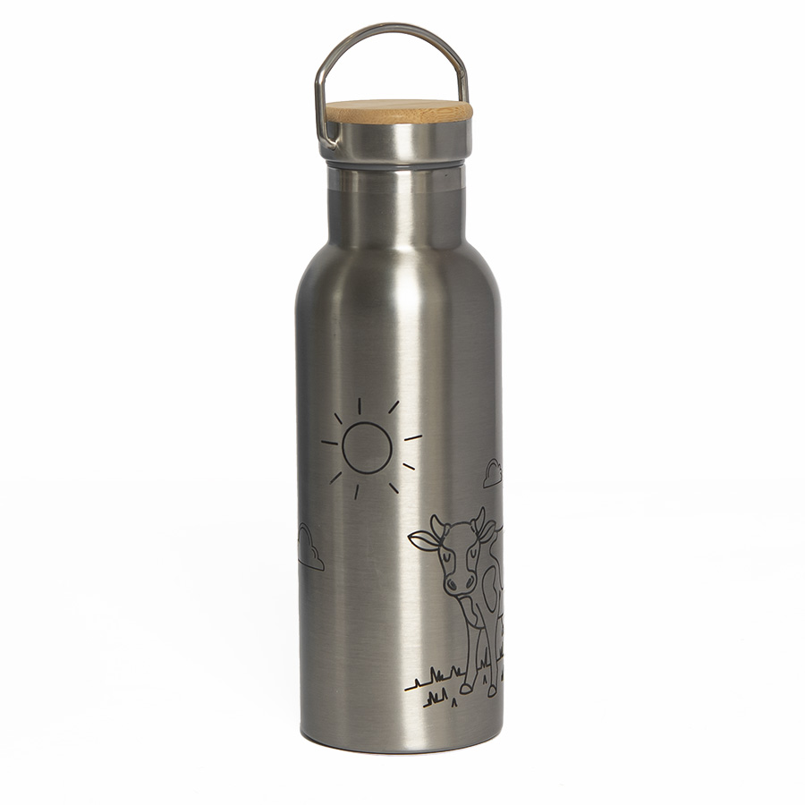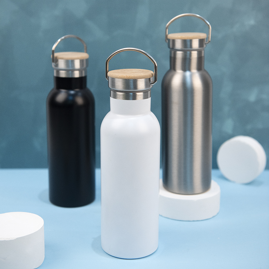 Бутылка для воды с двойными стенками из нержавеющей стали.Держатель на крышке для удобства переноски.Верхняя часть крышки из бамбука, отлично подходит для персонализации