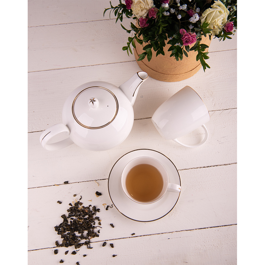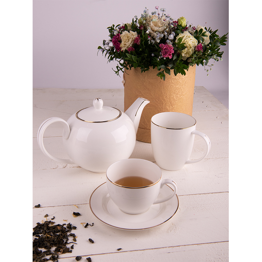Традиции художественного творчества от собственной торговой марки BRISTOL. Бережное наследие прошлого воплощено в чайном наборе GOLD. Набор выполнен из костяного фарфора, который создаст особый шарм чаепитию. Этот материал содержит в своем составе примеси обожженной костяной муки, которые придают ему необыкновенную белизну и легкость. Стенки такой посуды гораздо тоньше обычного фарфора, но при этом сохраняют такую же прочность. Отличительной чертой набора стал позолоченный кант по краю на каждой части набора. Чайник выполнен в классическом стиле с удобной ручкой. Объем в 1200 мл. рассчитан на уютное коллективное чаепитие. В комплекте две чайных пары, они представлены в виде чашек объемом 250 мл. и практичных блюдец с выемкой для фиксации чашек. Набор станет отличным подарком в духе императорского стола. Поставляется в подарочной коробке с ложементом.