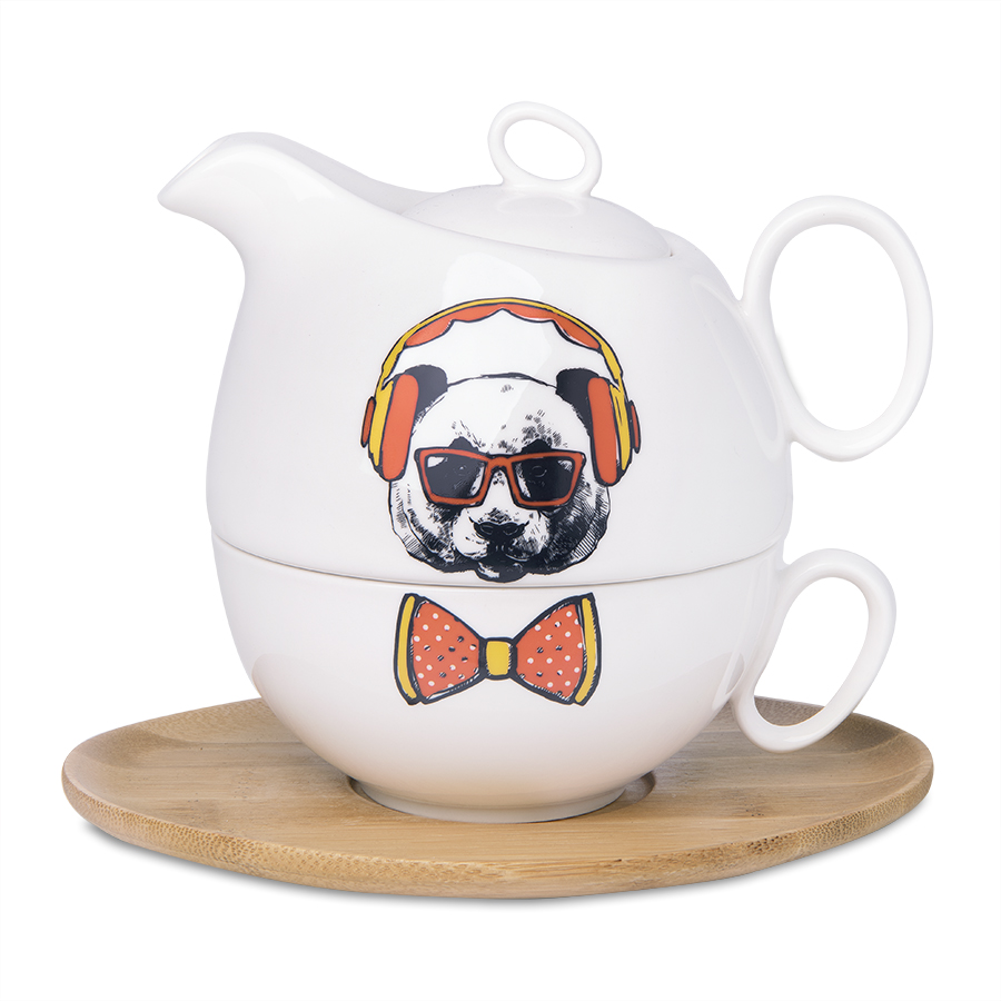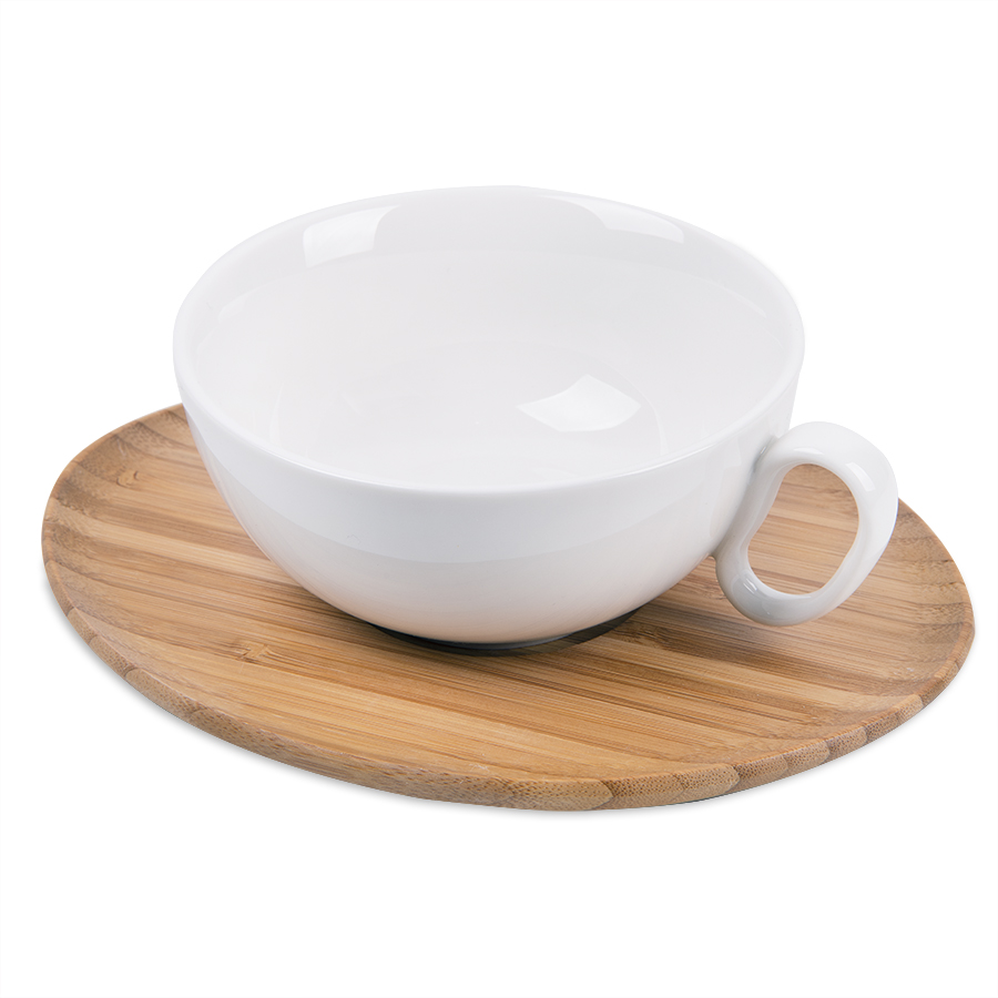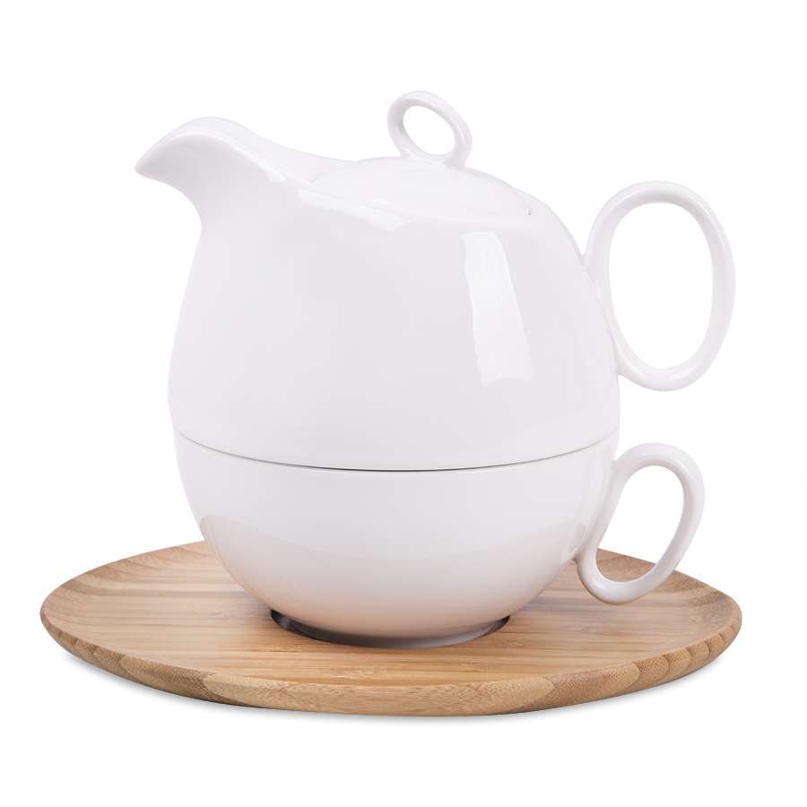 Необычный набор из фарфорового чайника и чашки на бамбуковой подставке-блюдце составит отличную теплую компанию истинным эстетам и эгоистам – разумеется, в хорошем смысле этого слова!Секрет этой пары в том, что чайник можно поставить на чашку сверху. Это позволяет и сэкономить место в кухонном шкафу или на рабочем столе, и сохранить температуру горячего чая или кофе как в чайнике, так и в слегка неполной чашке. Широкое блюдце не скользит и не царапает даже самую хрупкую поверхность, а оригинальный дизайн с удобными ручками-петельками впишутся в любой интерьер.Гармония элегантного фарфора и теплого и гладкого бамбука придаст особое очарование каждому чаепитию, придаст спокойствия и уверенности. Истинное удовольствие для настоящих интровертов!Осталось добавить только логотип – и индивидуальный подарок готов! Поставляется без упаковки