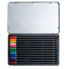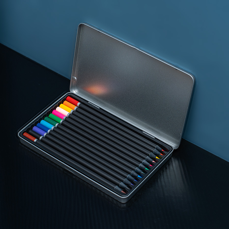 • яркие цвета 12 шт• круглый корпус из высококачественной черной древесины• прочный грифель 3.3 мм, класса А+• Окрашенный в цвет грифеля торец• легко затачиваются• упаковка: металлический пенал + коробка из крафта