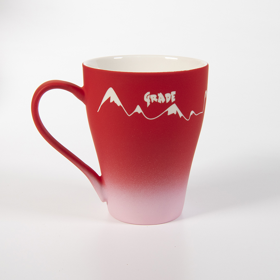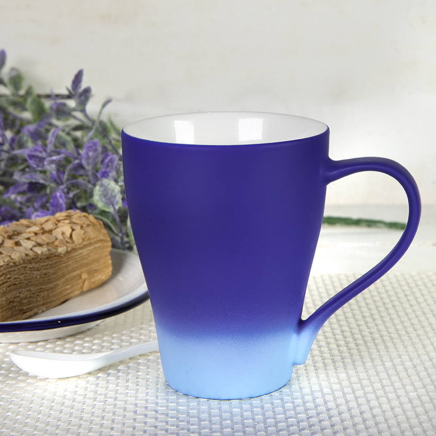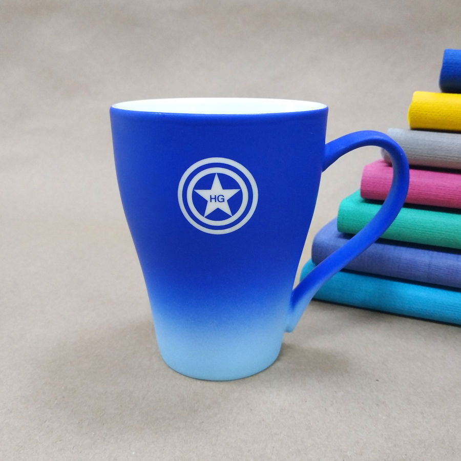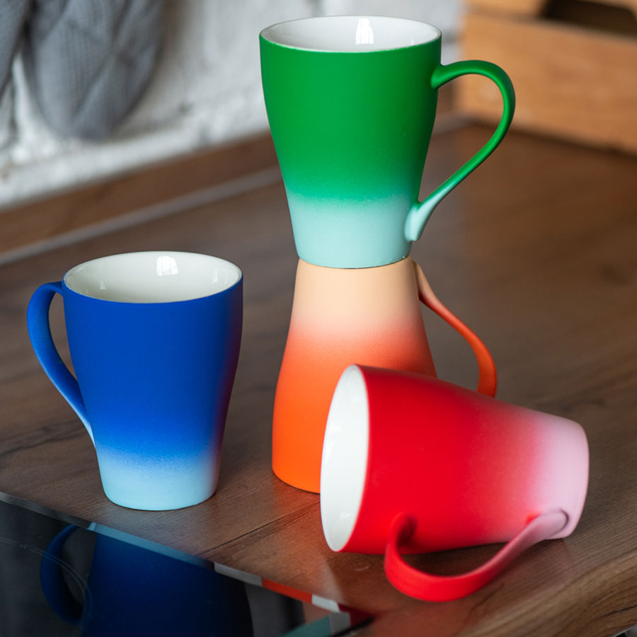 Переход от насыщенного оттенка в основной части кружки к совсем светлому внизу, для более выгодного представления логотипа на темной части Градиент — модный тренд, для его создания используются различные техники, краски и материалы, берутся различные цветовые сочетания