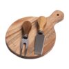 Набор для сыра: круглая доска с ручкой и два инструмента в комплекте — нож для мягкого сыра и вилка.