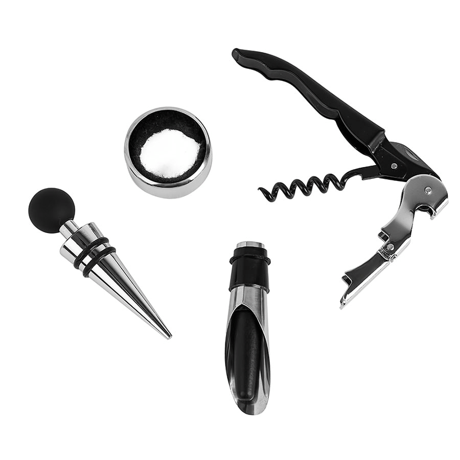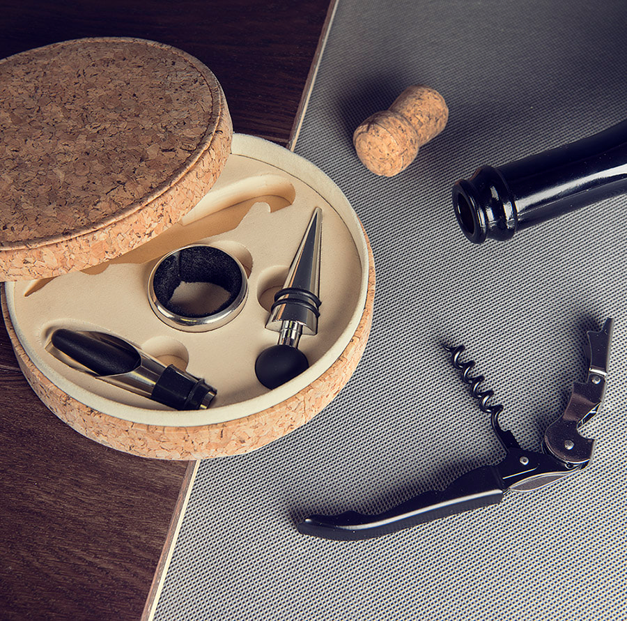 В комплекте: нож сомелье со штопором, пробка, воронка, каплеуловитель Достойный и солидный подарок для истинных ценителей вина и тех, кто хочет получить максимальное удовольствие от этого благородного напитка. Вино – не просто приятное дополнение к застолью, но и настоящий продукт творчества, как волнующая картина, захватывающая книга или чарующая музыка. Вино нужно раскрывать, познавать и узнавать, составляя свой любимый букет из тысячи оттенков, вкусов и нот. Набор из 4 предметов великолепно впишется в любой кухонный интерьер. Его круглый футляр с кремовым ложементом выполнен из имитации пробкового дерева. В комплекте самые нужные предметы – нож сомелье со штопором, пробка, воронка, каплеуловитель. Все для того, чтобы не пролить ни капли на деловой костюм, белоснежную скатерть или махровый плед.
