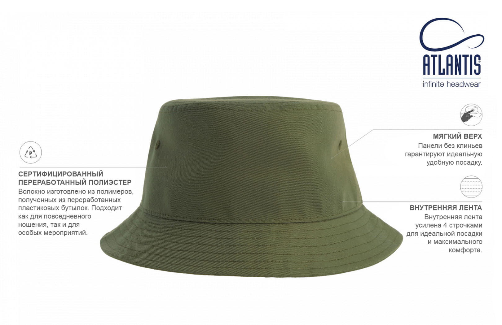Стильная панама GEO изготовлена из 100% переработанного полиэстера. Она свободно облегает голову, создавая непринуждённый образ.