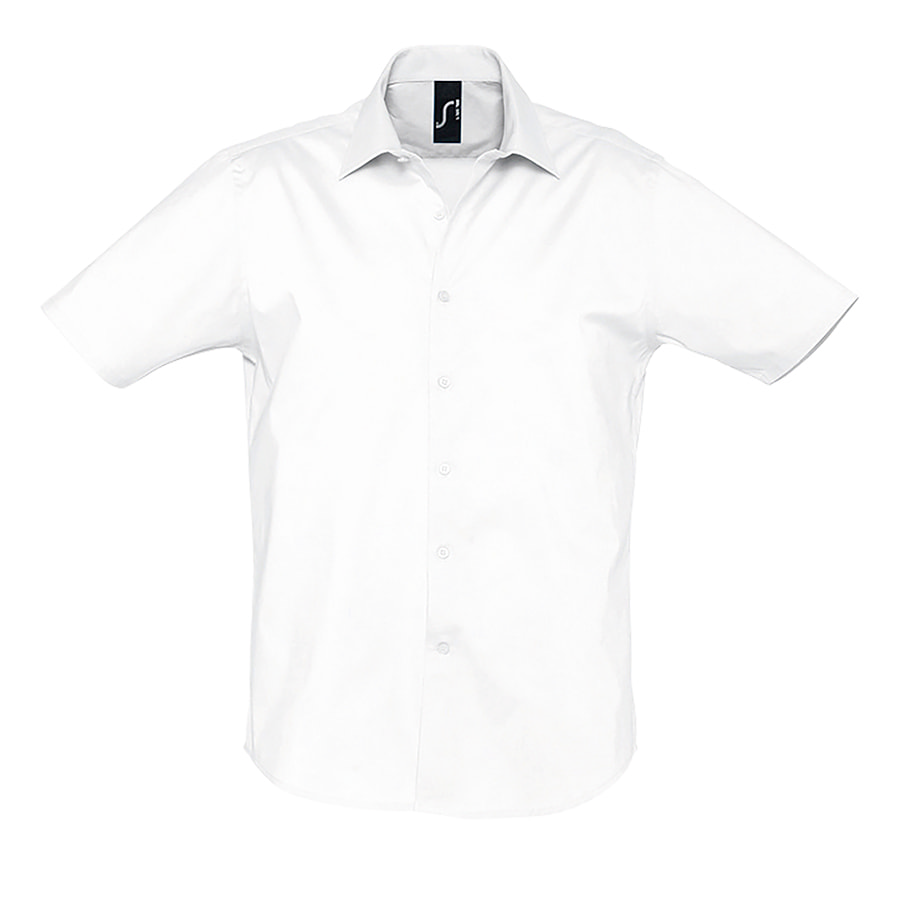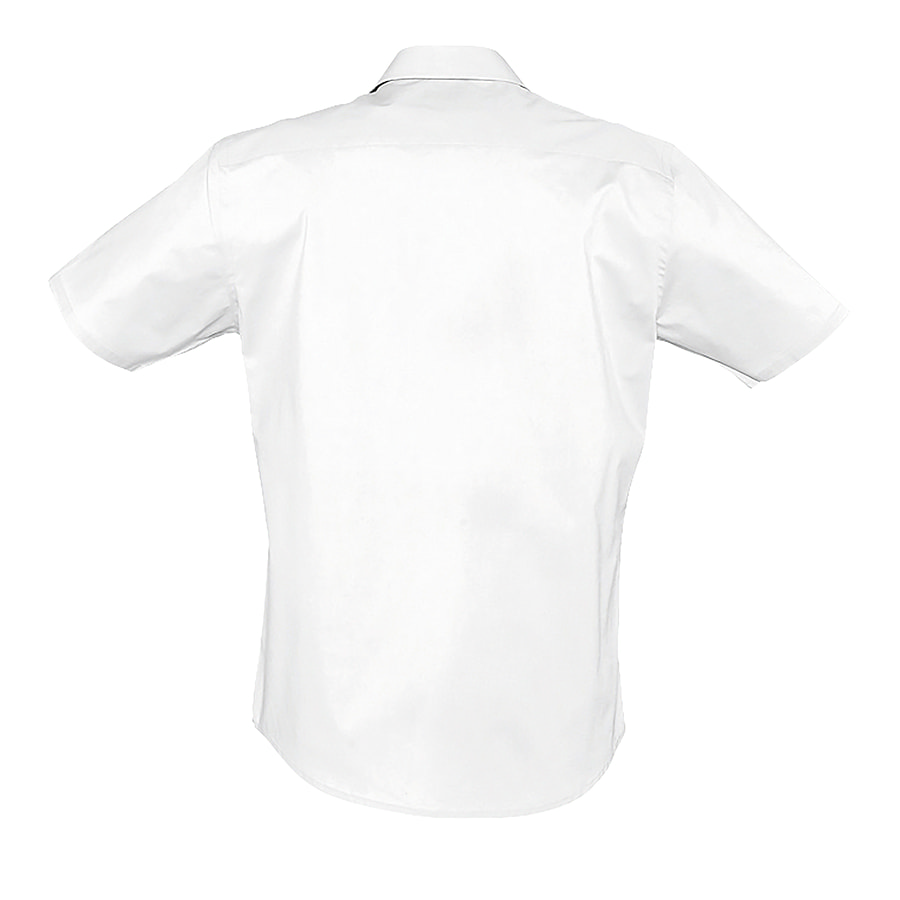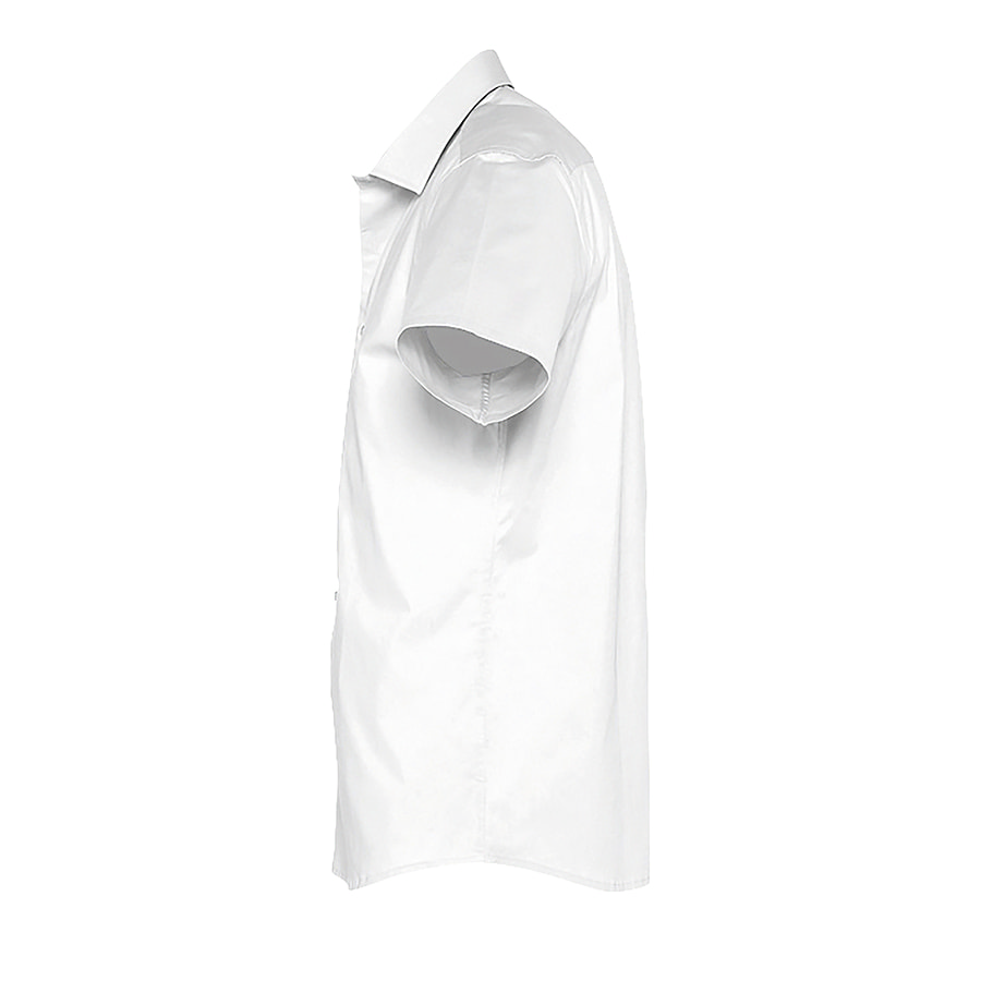 Мужская рубашка с коротким рукавом из ткани стрейч. Итальянский полуоткрытый воротник с 1 пуговицей. Облегающий крой, планка на 7 пуговиц в тон изделия.