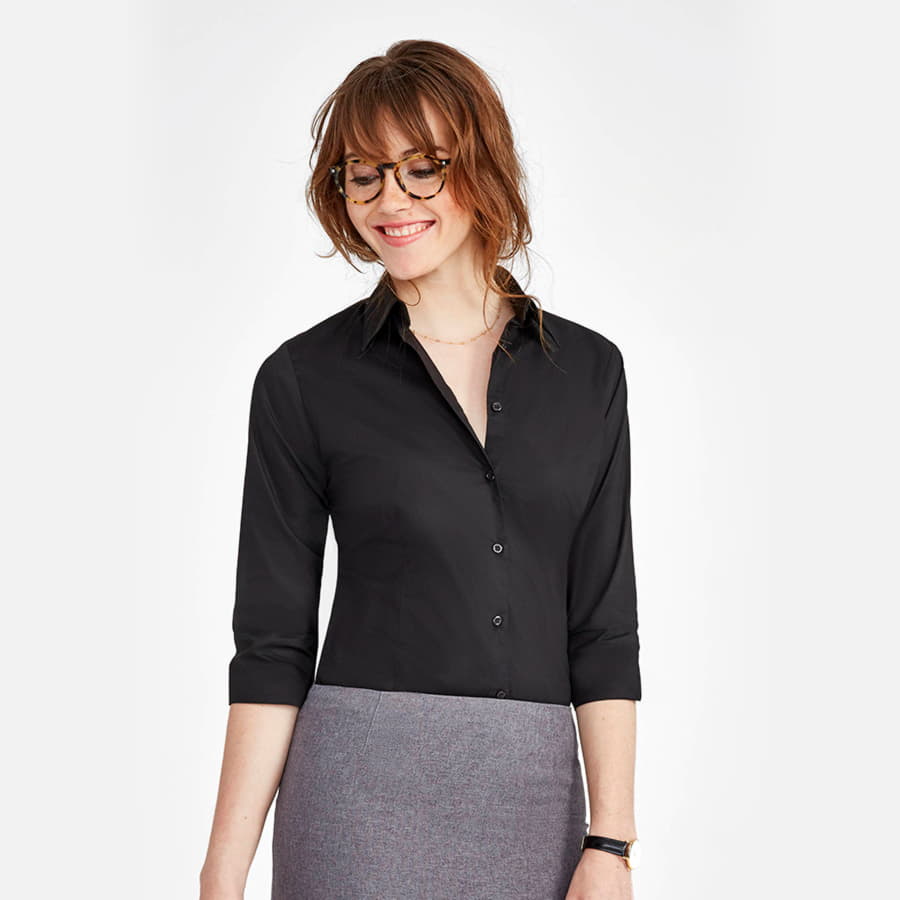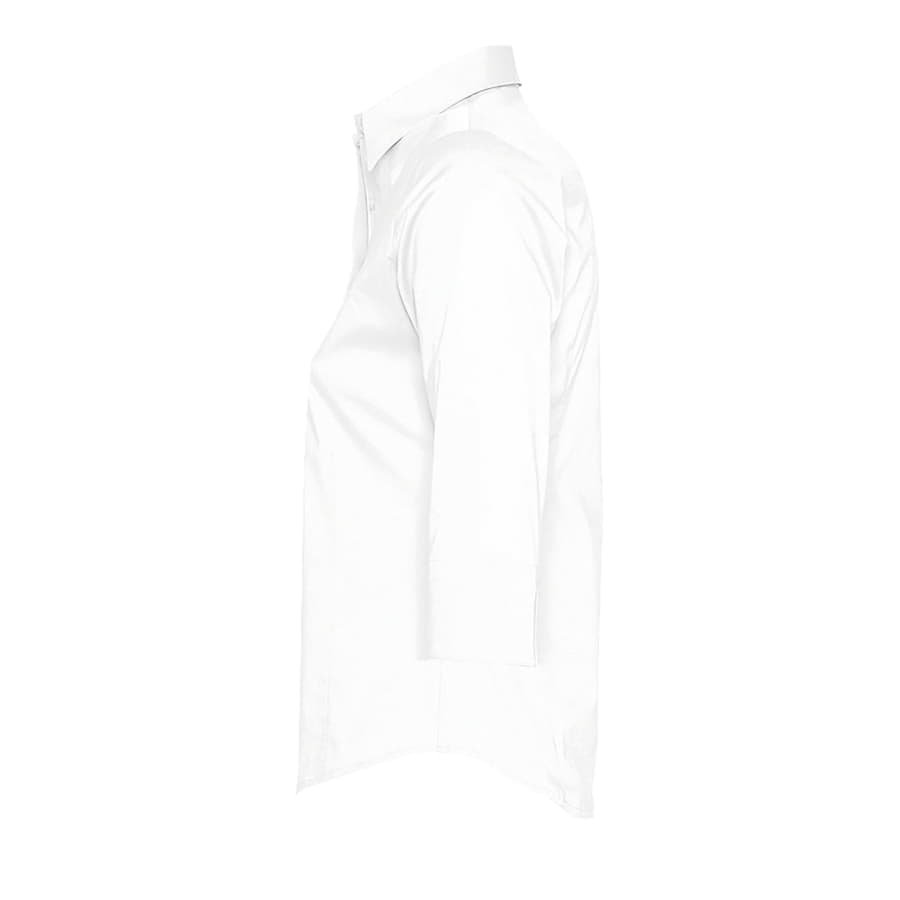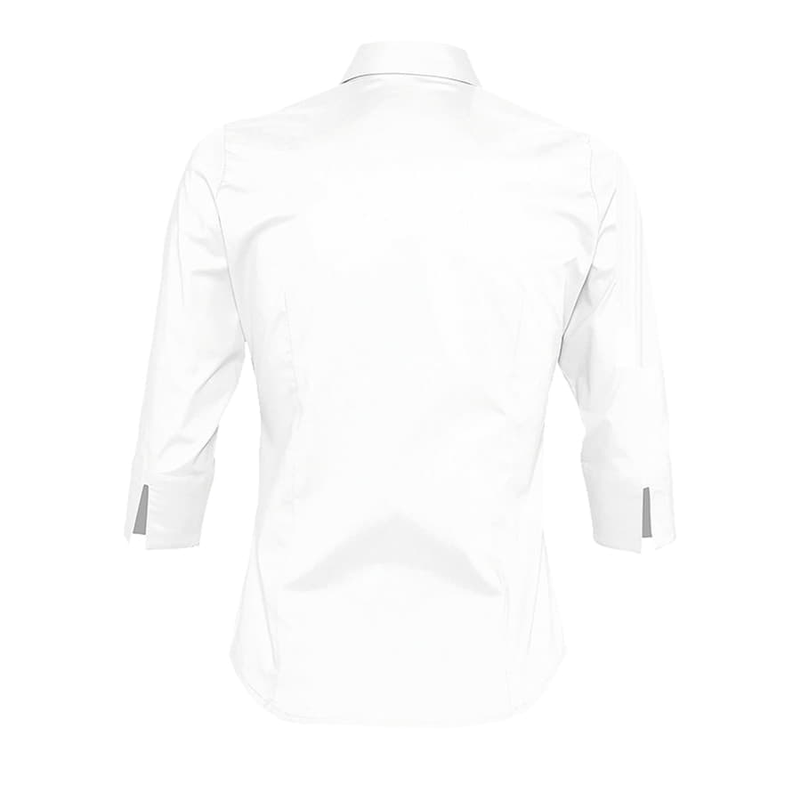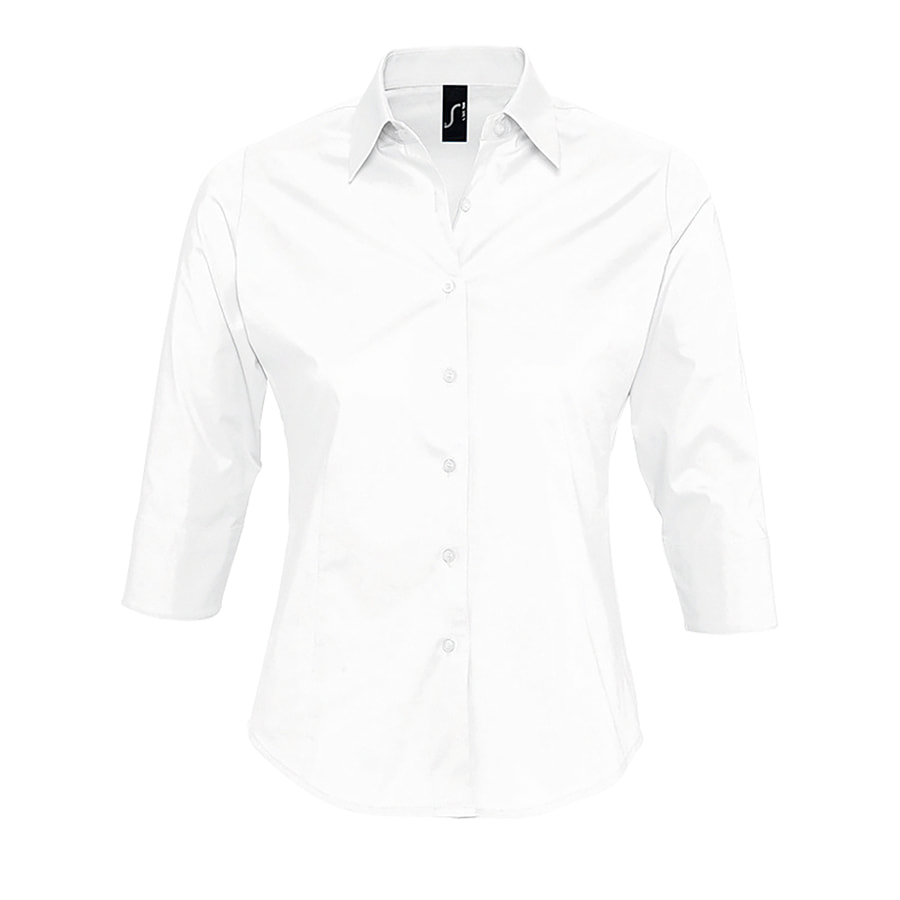 Женская рубашка из ткани стрейч. Рукава 3 4 с отворотами и разрезами. Приталенный крой. Планка на 7 пуговиц в тон изделия. Вытачки спереди и на спинке.