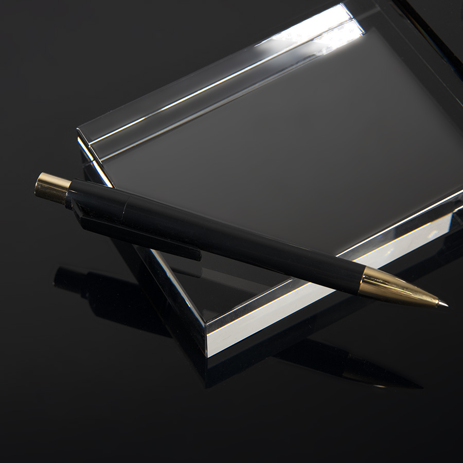 Элегантная ручка Mood — символ благородной роскоши и отражение актуальных тенденций мира дизайна. Ручка обладает приятной тяжестью, свойственной металлическим ручкам, и комфортно лежит в руке благодаря плавной обтекаемой форме корпуса. Широкий клип и корпус обеспечивают большое поле для нанесения логотипа, а высококачественный ABS-пластик гарантирует его стойкость и великолепный внешний вид ручки. Металлические носик и кнопка с зеркальным покрытием «под желтое золото». Процесс обработки металлических деталей проходит под тщательным индивидуальным котролем, что гарантирует гладкость и безупречный блеск покрытия. Цвет корпуса, близкий к Pantone Black C. Стержень Plastic Parker type, пишущий узел 1.0 мм, синие чернила Dokumental, до 4000 м письма. Производство : Италия