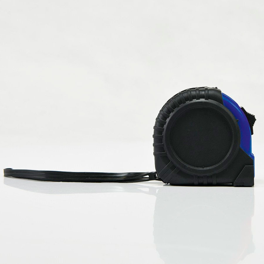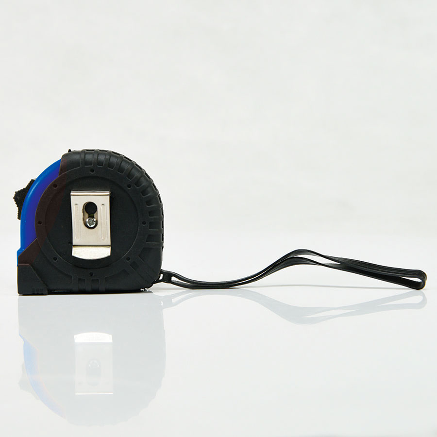5-ая рулетка с фиксирующим механизмом. Корпус, покрытый защитным чехлом из прочной резины, металлический зажим для ремня и ремень для переноски.