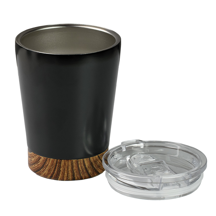 Стильная термокружка с черным матовым корпусом и декоративной вставкой с имитацией фактуры дерева soft-touch. Двойные стенки из стали сохранят напиток горячим до 3х часов. Высота без крышки 11,4 см, подходит для большинства кофемашин. Индвидуальная упаковка — белая картонная коробка
