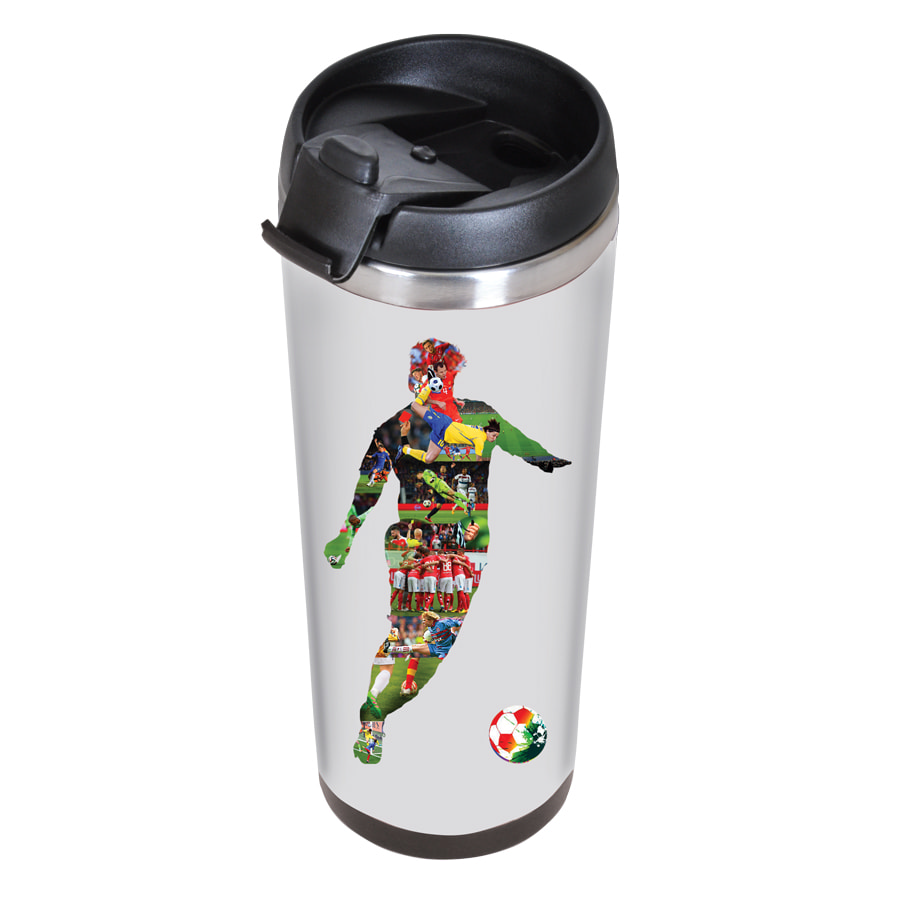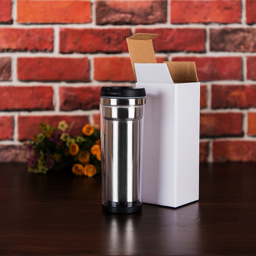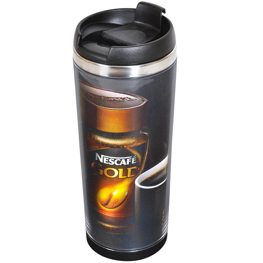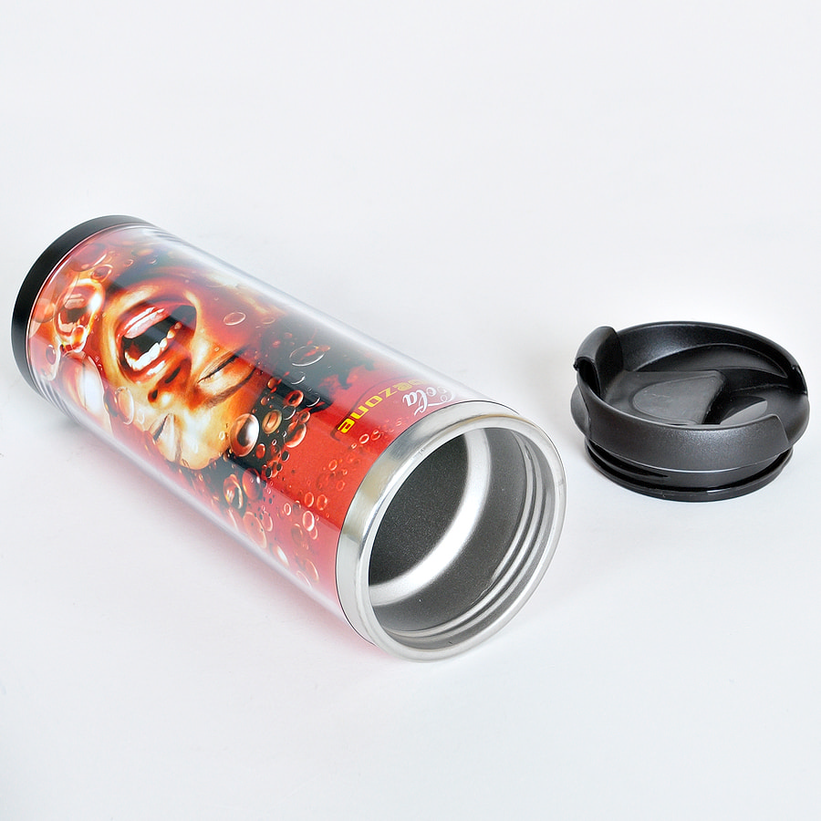 Термокружка с колбой из нержавеющей стали с огромным полем для печати, на котором можно разместить не просто логотип, а целый буклет. Полноцветная вставка занимает всю поверхность стакана и смотрится очень органично. Для сборки и разборки не требуются клей или специальные инструменты — изображение помещают в пространство между внешним и внутренним слоями корпуса. Хранит тепло 2-3 часа.
