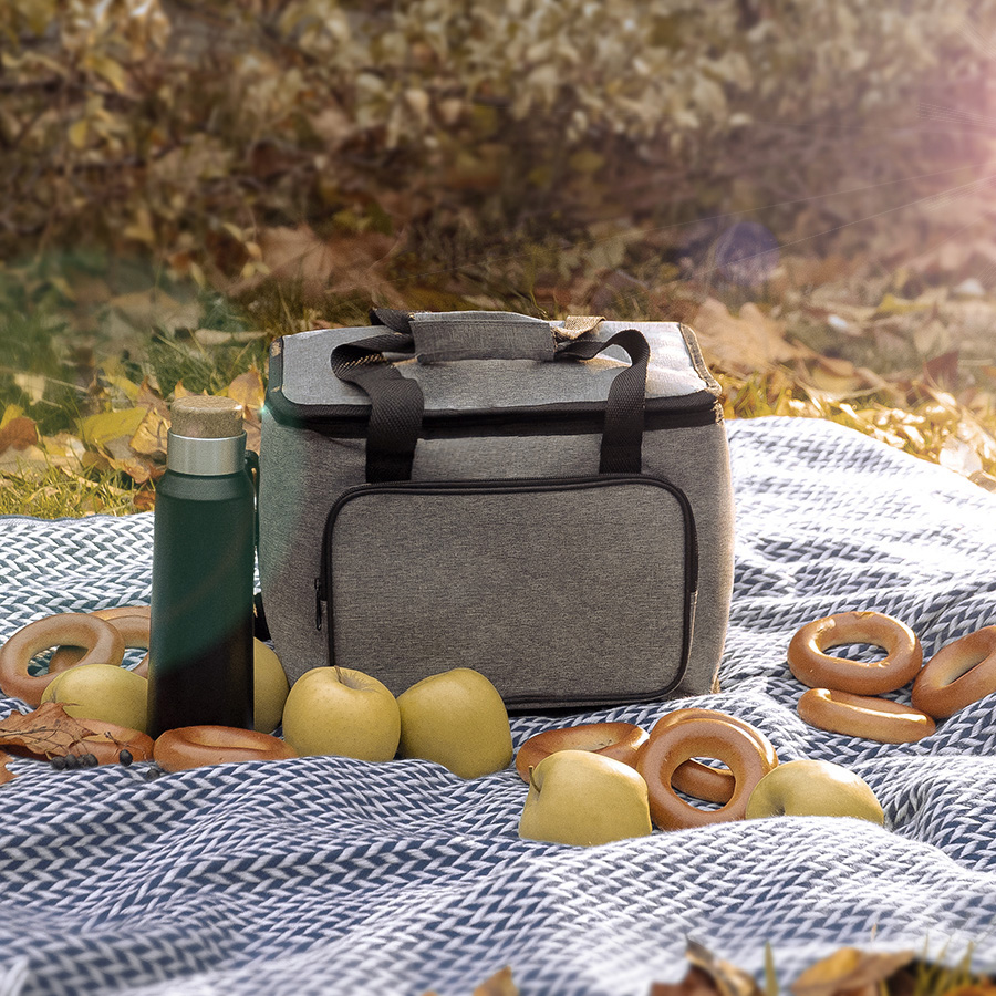 Сумка-холодильник с прочными двойными ручками,лямкой на плечо и внешним карманом на молнии из прочного меланжевого полиэстра 600D Внутреннее отделение из PEVA.Объём:15 литров.