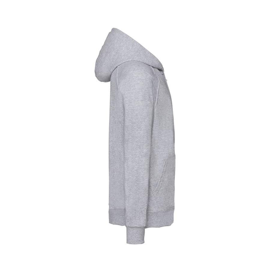Футровая ткань без начеса. Капюшон с плоским вытяжным шнуром в тон изделия. Скрытая пластиковая молния для нестандартной печати. Два передних кармана. Рукава-реглан.